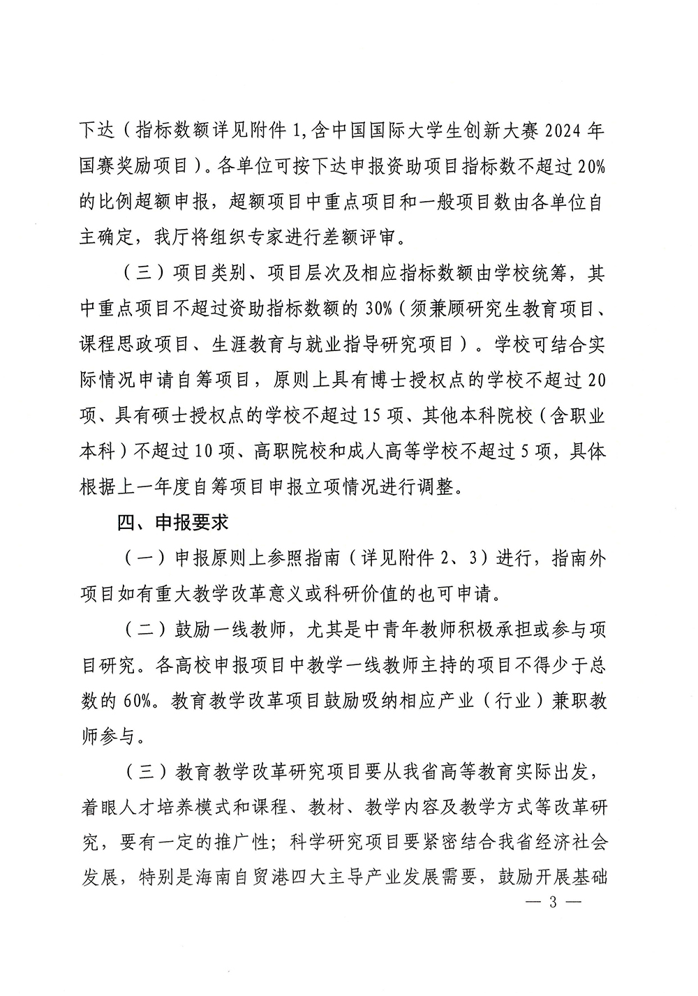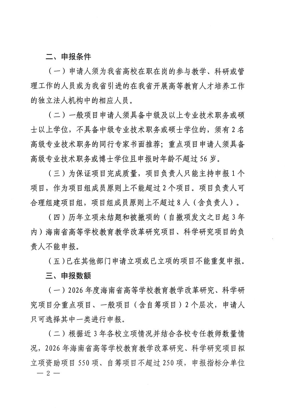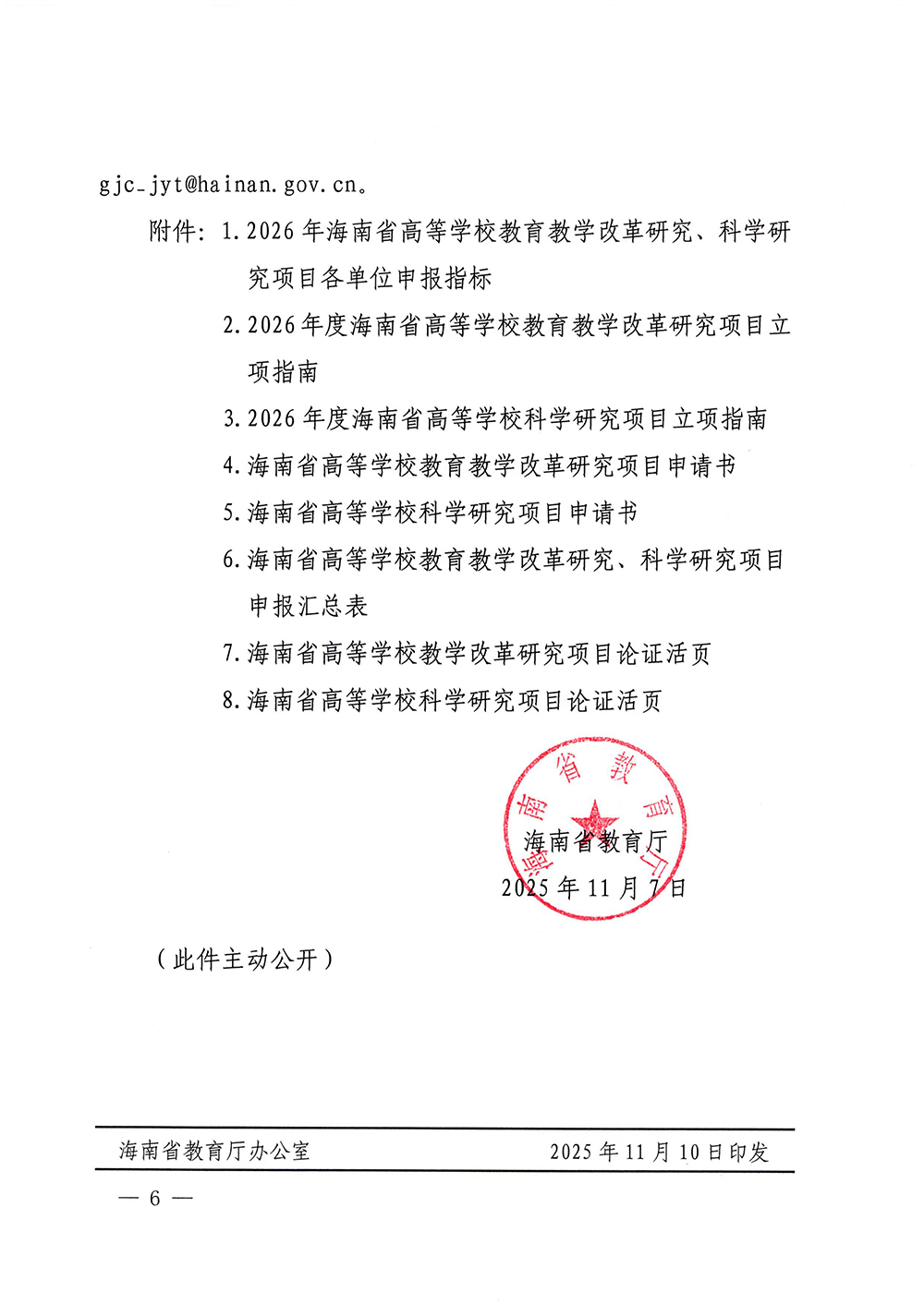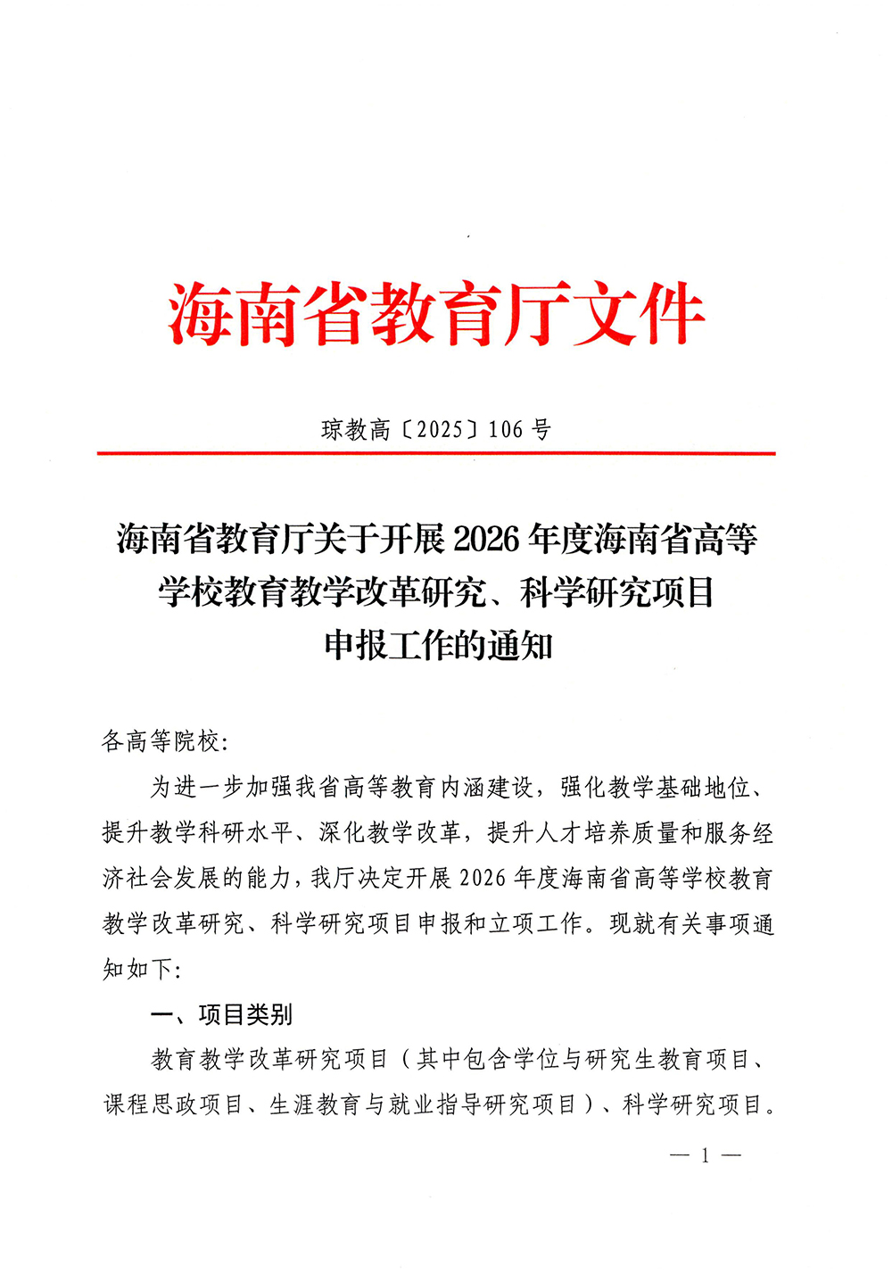 海南省教育厅关于开展2026年度海南省高等学校教育教学改革研究、科学研究项目申报工作的通知