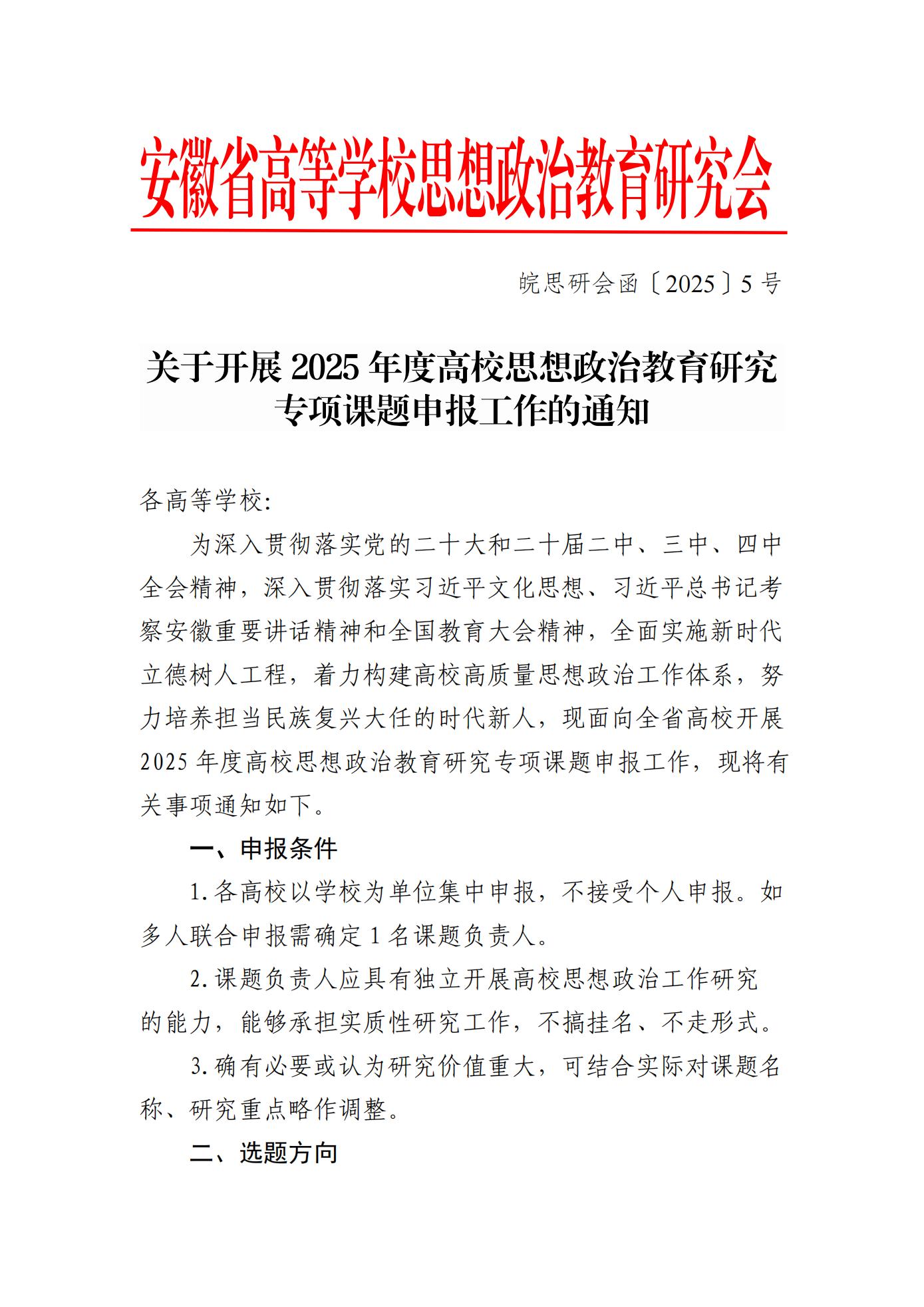 关于开展安徽省高等学校思想政治教育研究会2025年度高校思想政治教育研究专项课题申报工作的通知