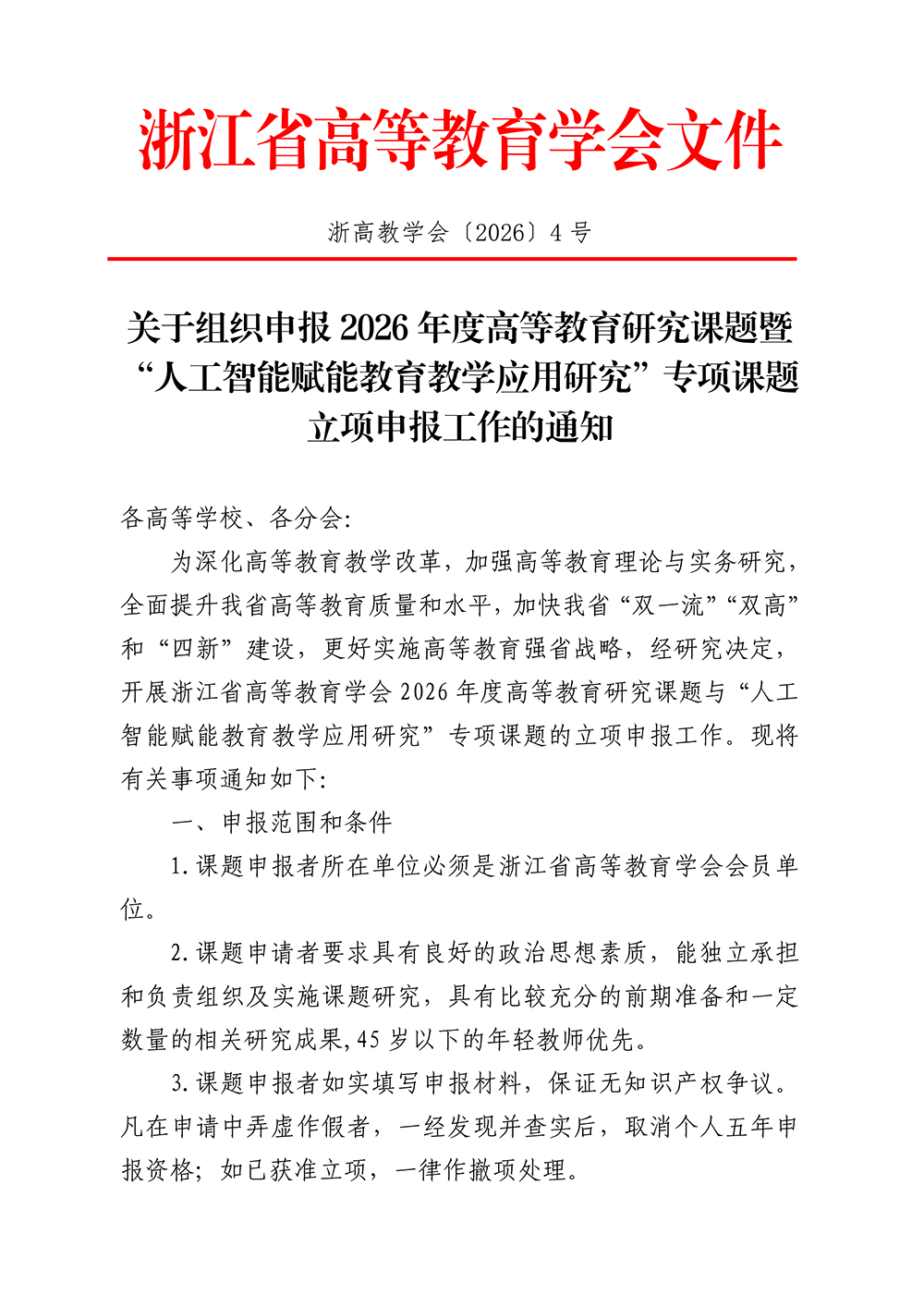 浙江省高等教育学会2026年度高等教育研究课题暨“人工智能赋能教育教学应用研究”专项课题申报通知